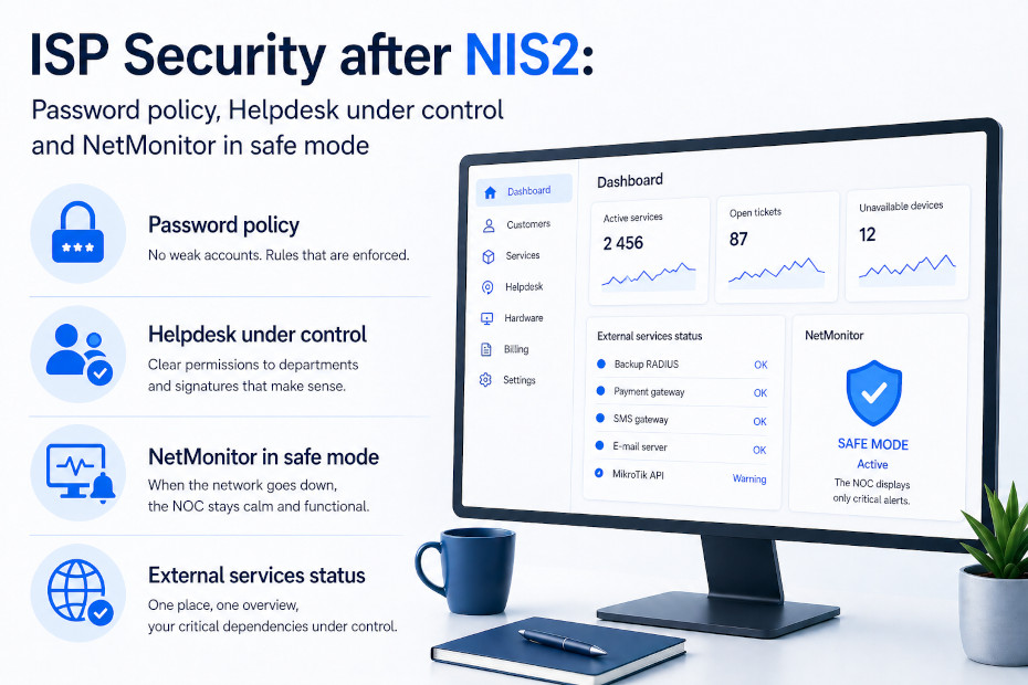 In December, we wrote about how ISPadmin supports a more secure ISP operation — 2FA, roles and permissions, TLS with Let’s Encrypt, and bulk password changes on MikroTik. But NIS2 requires more than one-time measures; it demands demonstrably managed access, enforced policies, and operational continuity even on a bad day.